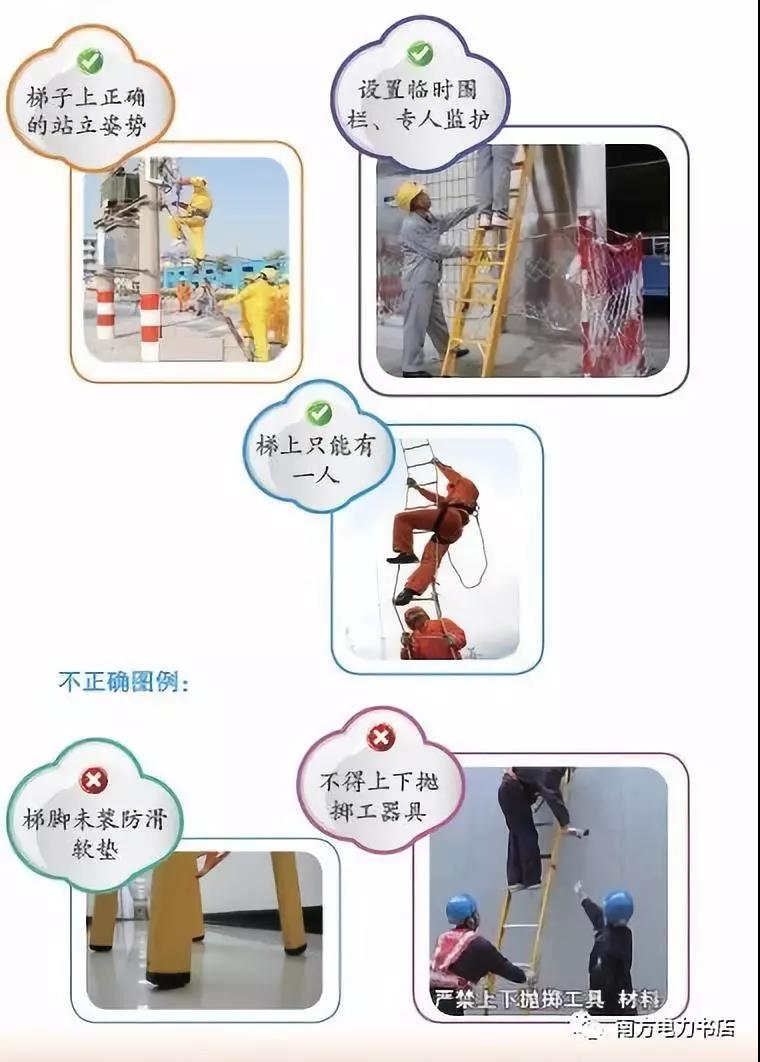 (7)作業(yè)人員在梯子上正確的站立姿勢是:一只腳踏在踏板上,另一條腿跨入踏板上部第三格的空擋中,腳鉤著下一格踏板;人員在上、下梯子過程中,人體必須要與梯子保持三點接觸。