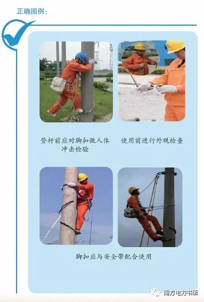 (1)登桿前,使用人應(yīng)對腳扣做人體沖擊檢驗,方法是將腳扣系于電桿離地0.5m左右處,借人體重量猛力向下蹬踩,腳扣及腳套不應(yīng)有變形及任何損壞后方可使用。