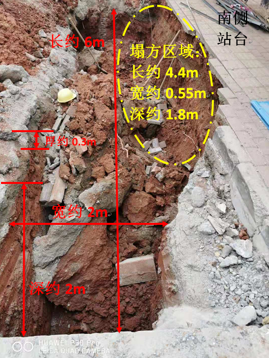 溝槽開挖處上層為原龍海二路混凝土硬化路面,厚約0.3m,南側(cè)臨龍海二路惠豐城公交站站臺鋪磚區(qū),現(xiàn)場采用挖機(jī)垂直開挖;開挖溝槽寬度約2m,長度約為6m,深度約為2m(局部2.3m)。