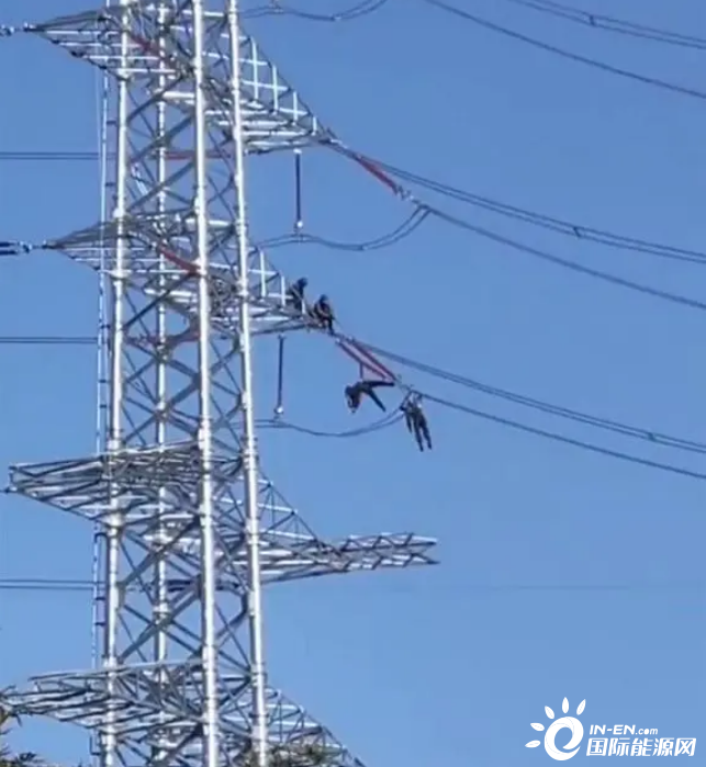 網(wǎng)友拍攝的視頻內(nèi)容顯示,在一道路附近的高壓線桿上,兩名人員的身體懸掛在線纜上一動不動,疑似發(fā)生觸電事故,一旁則是架設(shè)的高壓電力設(shè)施。極目新聞記者注意到,兩名人員身穿黑色衣服,頭戴安全帽,因事發(fā)地位于道路交叉口,附近來往行人和車輛較多,不時(shí)有市民在一旁圍觀。