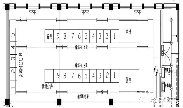 在輸煤配電室內(nèi),同時(shí)設(shè)計(jì)布置灰?guī)霢、B兩段MCC。兩段MCC各帶一個(gè)浪涌保護(hù)器,分別設(shè)置在兩段MCC進(jìn)線開關(guān)側(cè)。400V灰?guī)霱CC開關(guān)柜為MNS型開關(guān)柜?;?guī)斓裙孟到y(tǒng)的建設(shè)為A標(biāo)段的工作內(nèi)容,天津公司負(fù)責(zé)灰?guī)霱CC安裝,天津公司分包給中某建設(shè)實(shí)施。輸煤系統(tǒng)和灰?guī)祀娫唇泳€圖見圖一;配電室俯視示意圖見圖二。