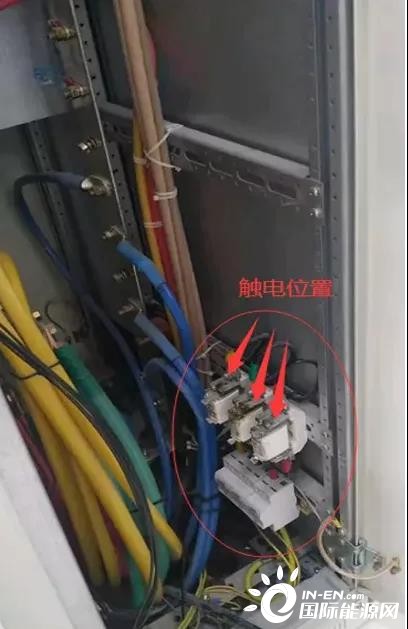 8月28日8點(diǎn)22分,王某帥(戴絕緣手套)完成本人負(fù)責(zé)的間隔電纜穿線并固定后,聽到隔壁柜發(fā)出聲響,檢查發(fā)現(xiàn)耿某坡(穿短袖上衣、未佩戴絕緣手套)身體倒進(jìn)灰?guī)霢段MCC柜01間隔,右臂肘部及上臂與該柜浪涌保護(hù)熔斷式保險(xiǎn)上插頭(裸露)三相搭接(現(xiàn)場照片見圖三)。王某帥立即通過拖拽耿某坡鞋子將其拉出間隔,并告知現(xiàn)場保安撥打120急救電話,同時(shí)進(jìn)行不間斷心肺復(fù)蘇,通知本隊(duì)伍經(jīng)理霍某平。