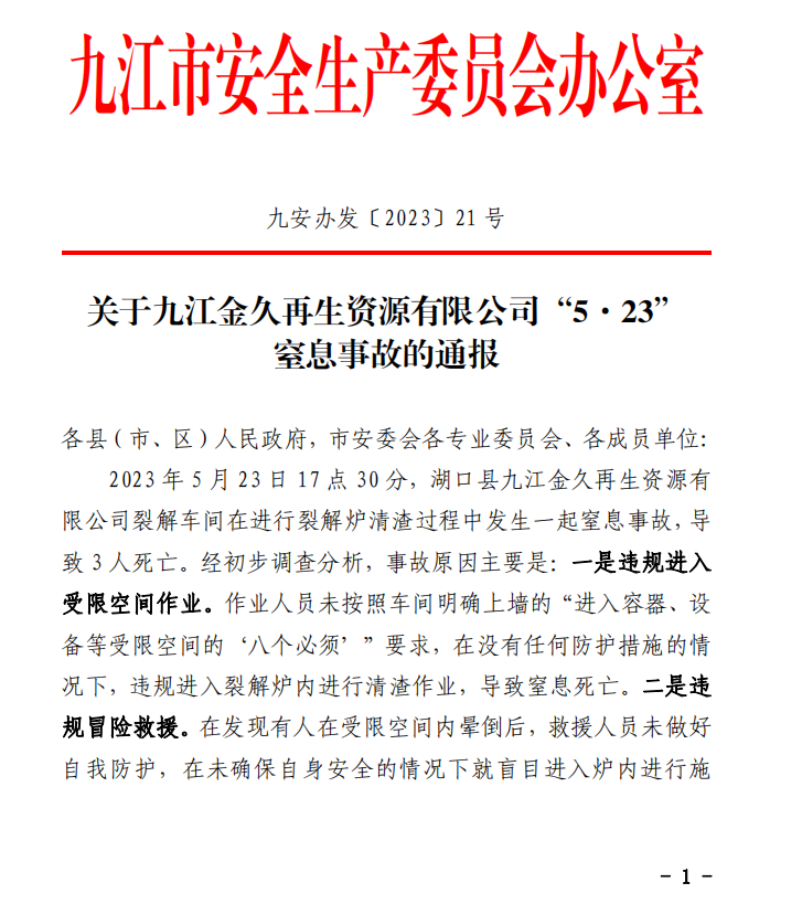 湖口縣九江金久再生資源有限公司裂解車間在進(jìn)行裂解爐清渣過程中發(fā)生一起窒息事故