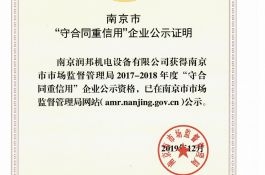 2020年2月26日,接到南京市企業(yè)信用管理協(xié)會通知,南京潤邦機(jī)電設(shè)備有限公司再次通過2017-2018年度市級“守合同重信用”企業(yè)的認(rèn)定。誠信潤邦,傾心服務(wù)。